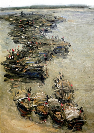 这次他的“油画·风景写生展”,就是以大海、渔船和渔民生活等题材为主,“渔民以船为家,大部分时间都是在海上奔波忙碌。很多时候是天人合一,和谐相处;但也有刮台风等大自然狂暴的时刻,台风过境后渔船、鱼排被损毁,渔民流泪的景象令人触目惊心,为之叹息;但人又不屈服于大自然,体现了顽强的生存意志和生命力……辽阔壮丽的海天背景下,这种人与大自然的关系是非常值得去进行挖掘和艺术创作的。”