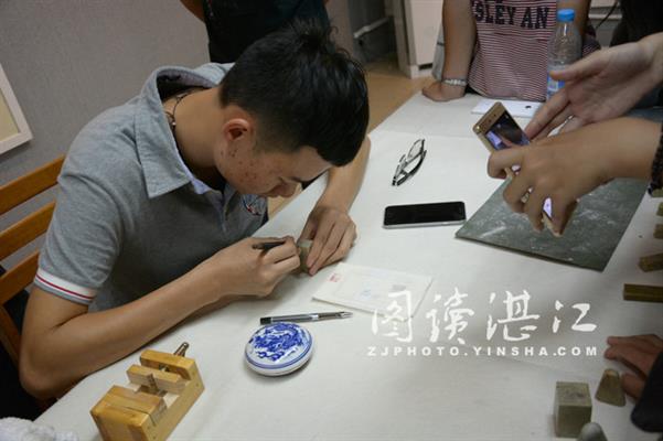 学生现场展示篆刻技法