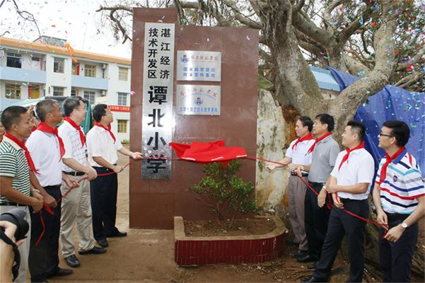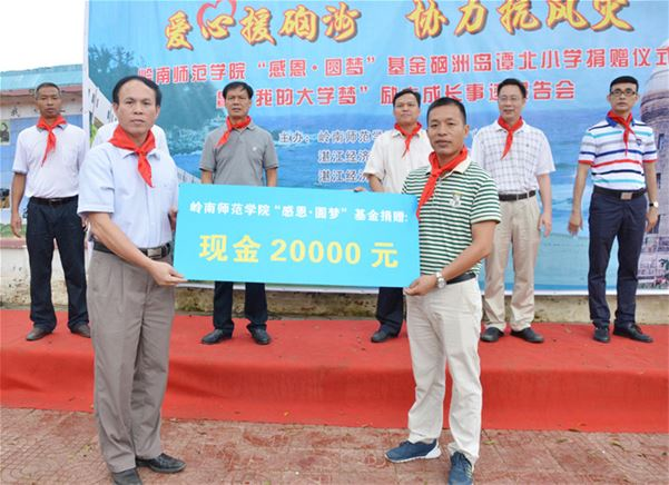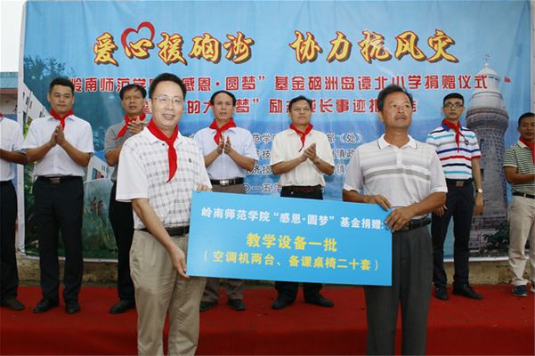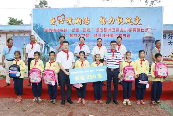 由于硇洲谭北小学的办学资源有限,该校还面临许多实际困难。为此,“感恩·圆梦”基金捐赠给该校资金和物资一批。在捐赠仪式上,梁英书记为谭北小学捐赠现金2万元,彭权群副书记为谭北小学捐赠多媒体教学设备、空调等物资一批,党委办黄达海主任和学生处李粤处长分别给谭北小学的小学生们捐赠了250个新书包。为了表达诚挚的感谢,谭北小学陈从友校长代表学校回赠给岭南师范学院一面锦旗,窦梦怡同学作为小学生代表表达了对岭南师院的感谢和激动之情,并发言表示会以此为励,努力学习,回报社会。
