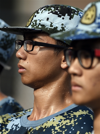 9月18日上午,烈日当空,记者在岭南师范学院军训现场看到,新生们在烈日底下满头大汗地站军姿、练正步。“从9月15日起,我们学院开展为期两周的军训,每天训练8个小时左右。”一名戴着眼镜的“学生教官”说。记者留意到,为对抗炎热的天气,除了大瓶大瓶的水外,树荫下还有老师和师兄师姐专门为新生准备的葡萄糖和消暑的药物。