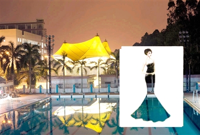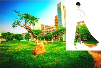 “岭南师院有多美?你穿上就知道了”系列时尚插画,主要是以岭南师范学院的建筑为背景,胡秋彬首先将时装插画在纸张上简单的勾勒出来,然后将插画的衣服部分切割镂空,再叠加到岭师校园的景观上,镂空的服装轮廓这时就成为了一个窗口,巧妙的将校园景观化为独特的视觉艺术,最终得出模特将岭师“穿”在身上的效果。