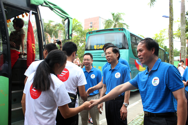 然后,梁英发表了热情洋溢的讲话,他鼓励岭南师范学院青年大学生深入社会实践,运用所学知识,磨练意志,奋力实践成才。接着,梁英对即将奔赴全国各地开展社会实践活动的莘莘学子提出了三点希望和要求:一、深入社会实践,在实践中得到真正的锻炼;二、要牢固树立“安全第一”的思想,平安归来;三、记录、总结三下乡经验和收获,归来分享交流。同时,梁英也表达了对各实践队的美好祝愿,希望他们能积极奉献基层,争取向全国、全省的先进实践队迈进!最后,梁英宣布岭南师范学院2015年大学生暑期“三下乡”社会实践暨湛江市“科普惠农”行动正式出征!