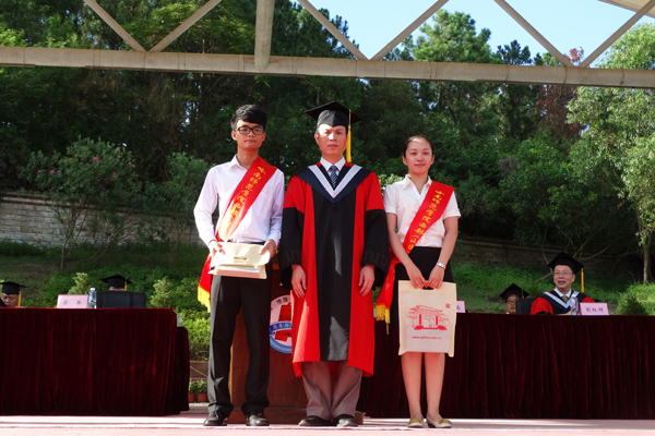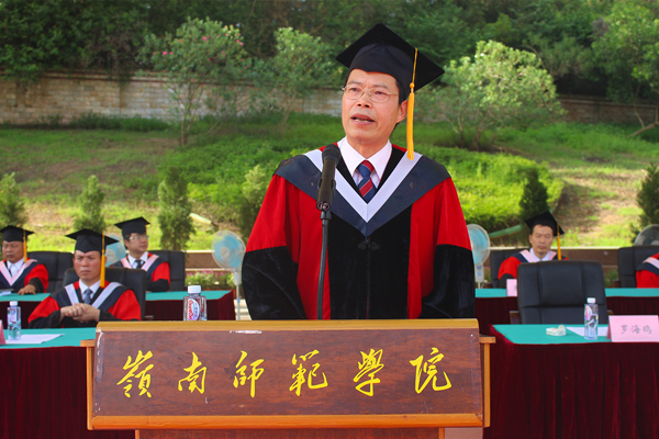 岭南师范学院学位评定委员会主任委员罗海鸥院长给毕业生代表颁发毕业证和学位证书后,在《你身所在 便是岭师》的致辞中深情地说:“今天,注定是你们人生中最值得纪念的重要日子,你们最后一次以大学生的身份,参加学校活动而且是最为重要的毕业典礼,然后你们将告别朝夕相处了四年的老师和同学,离开熟悉而美丽的校园,走向社会,开启人生新的历程。”罗院长把2015届突出表现的学生的“大学故事”娓娓道来,“在你们当中,有从贫困生成为拿到五所世界知名大学研究生offer的‘励志达人’陈丽冰同学;有从体育生成为‘全能型人才’的‘创业达人’姜遵清;有热衷于志愿公益服务的‘公益达人’王志平;有潜心科研获得国家发明专利的‘创新达人’郭超明……”