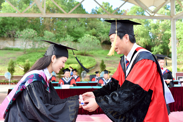 岭南师院罗海鸥院长为毕业生代表扶正流苏,颁发学位证书