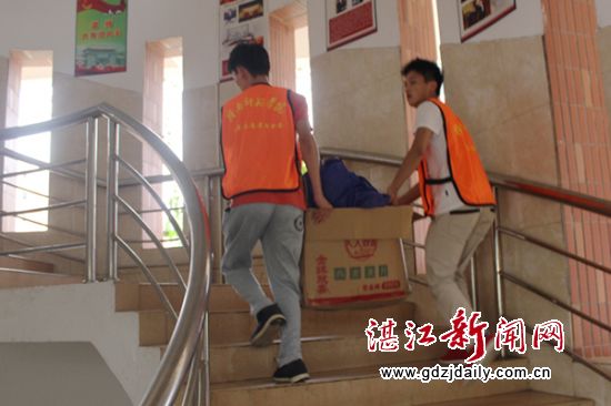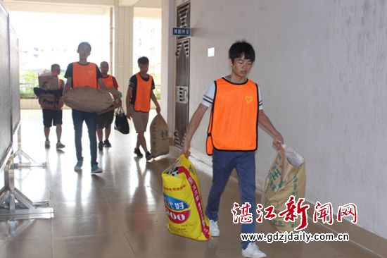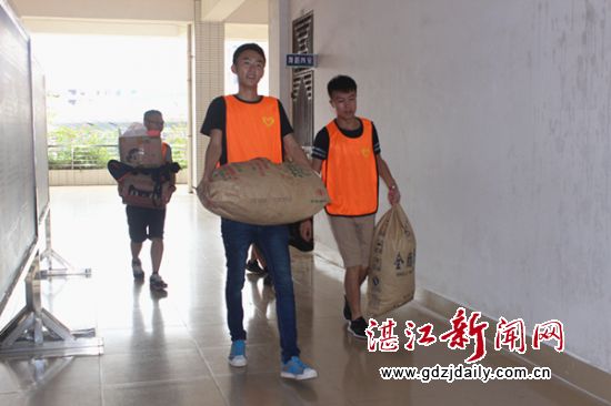 另外,在校园的道路上随处可见正在搬运大麻袋的男生志愿者们。随着太阳的爬升,气温越来越高,每位志愿者都是大汗淋漓、气喘吁吁的,但他们依然坚持着从各宿舍将一个个大麻袋搬上了4楼的仓库,而且来回不下10次。志愿服务精神在他们身上体现得淋漓尽致。