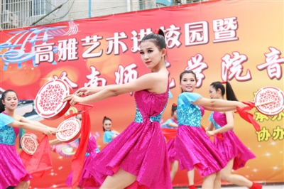 湛江晚报4月29日讯 4月28日,岭南师范学院师生走进湛江市第八中学,开展“高雅艺术进校园”活动,送去舞蹈《鼓舞声声》等丰富精彩的文艺节目,受到热烈欢迎和好评。