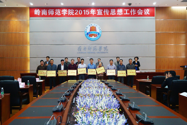 会上对岭南师范学院2014年入选广东省“百系列”学校德育优秀成果进行通报表彰,与会校领导为岭南师范学院2014年校园网络文化建设与管理先进单位和先进个人颁发了荣誉奖牌和证书。黄钢副院长宣读表彰决定。