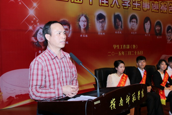 岭南师范学院党委梁英书记向当选“十佳”的同学表示热烈的祝贺和由衷的敬意,并向全校教职工为大学生成长成才所付出的辛勤劳动表示感谢。梁英书记与同学们共同分享了十佳大学生带给他的感动,逐一重温了十佳大学生报告中最精彩的话语:郭超明说“大学不能仅仅为了成绩而学习”、郑宏彬“压力使我订好规划奋进,向着目标奋进”、黄恋婷说“大学四年,没有一个完整的暑假”、杨文青说“体育更靠后天的勤奋努力”、郑玉琼说“我每天精听泛听达四个小时以上”、邓光超说“我要给西藏的孩子带来音乐的快乐”、林建妮说“以服务赢得村民的支持”、何淑文说“我从来没有放弃过,因为我有满满的信心”、王志平说“志愿服务,平凡而伟大”、黄小华说“把讨厌的变成喜欢的,把喜欢的变成更喜欢的”。梁英书记指出,十佳大学生从十个不同的角度汇报了自己的成长事迹,证明校园文化具有鲜活的生命力,榜样的力量永不枯竭,十佳大学生的事迹彰显了岭南师范学院校学子立志成才,刻苦学习,勇于实践,奋发进取,全面发展的良好风尚。最后,梁英书记希望广大同学以十佳大学生为榜样,坚定信念,敢于担当,学会做人,苦练本领,勇于实践,积极乐观,炫出自己青春的色彩,用自己火热的青春梦助推伟大祖国的中国梦!