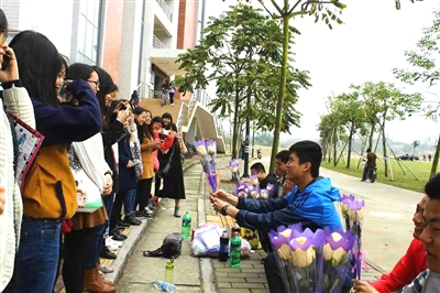 湛江晚报3月10日讯 鲜花、点心、甜品、巧克力、富有创意的搞笑横幅……3月7日是大学校园里一年一度的“女生节”,这一天,女生敞开心扉,尽情享受男生们给自己带来的各种“优待”。同时,这也是大男孩们向美眉“大献殷勤”的最佳时机。