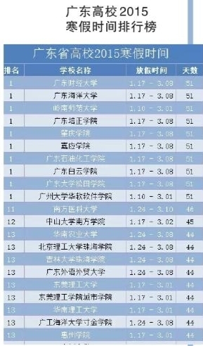 在网上热传的、由网友自己整理的一份《广东高校2015寒假时间排行榜》中,记者看到:广东海洋大学、岭南师范学院的寒假时间都是“51天”,和其他几所广东高校的寒假长度并列第一。
