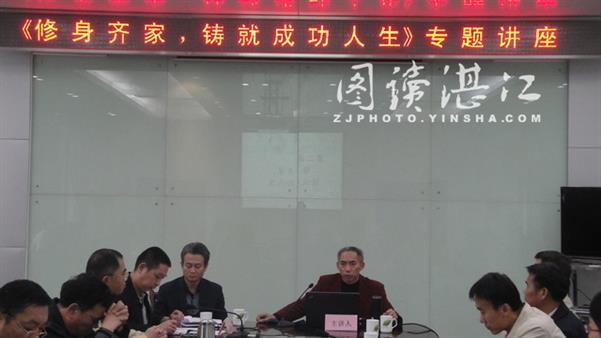 碧海银沙网1月8日讯(图文/王明彪 编辑/荣 蓉 蔚 青)1月7日下午,市科技局邀请岭南师范学院党委常委、副院长刘周堂教授作了一场以《修身齐家,铸就成功人生》为题的专题讲座。市科技局全体干部职工、市科协、市地震局领导干部参加了讲座。市政协副主席、市科技局局长欧先伟出席,市科技局党组书记洪涛主持。
