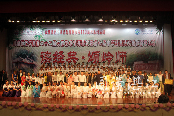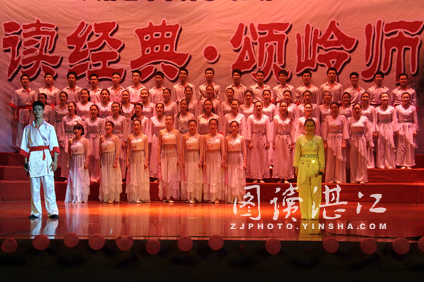 碧海银沙网11月25日讯 为进一步培育和践行社会主义核心价值观,纪念岭南师范学院师范教育110周年,提高大学生思想道德素质、丰富校园文化生活,11月23日晚,由岭南师范学院团委和语言文字工作委员会联合举办的第22届文体艺术节开幕式暨第七届中华经典诗文集体诵读大赛在学校音乐厅举行。