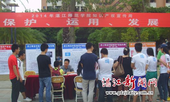 湛江新闻网4月26日讯 4月23日,我校科研处组织的以“保护、运用、发展”为主题的2014年湛江师范学院知识产权宣传周活动,在新区体育馆门前广场展开。