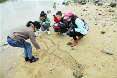 湛师护鸟队员在沙滩上画红嘴鸥。 记者 张锋锋 摄