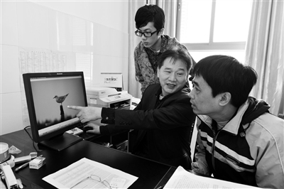 陈道海(中)向记者介绍红嘴鸥生活习惯。
