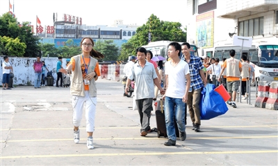 湛江晚报9月7日讯 今天上午,湛江师范学院迎来新生报到高峰。湛江师范学院共派出200多名志愿者,20辆免费巴士到赤坎海田汽车客运站、麻章汽车站、湛江火车西站、湛江火车南站接待新生。