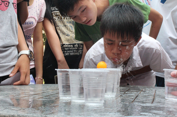 下午15点30分,游园活动热火朝天地开展着。活动一共包括“吹乒乓球”、“夹波珠”、“夹气球”“猜拳传筷子”“盲人喂蕉”、“定点投篮”、“踩气球”七个活动项目。每个项目都对启发学生的视觉和听觉潜力,对提高学生的注意力、反应能力等都具有重要作用。其中“踩气球”环节,更是完全激发了整个游园活动的气氛——学生们在游戏中更是不乏“群雄割据”、“三英战吕布”等精彩场面。即使游戏途中,有学生摔倒受伤流血了,但是他们也没有放弃,仍然像战士一样继续战斗下去。这种精神不仅展现了学生内心童真活泼的一面,更体现了学生们的团结互助的精神,这正是符合了我们Sun Shine服务队举办本次游园活动的宗旨。