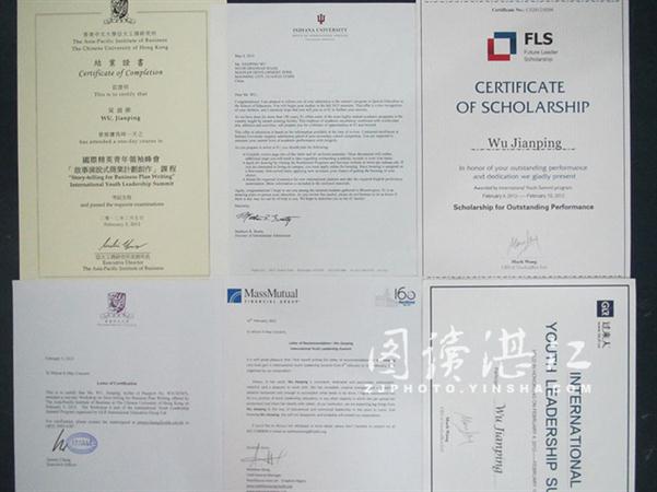 吴剑萍获得的通知书、推荐信、结业证书等。