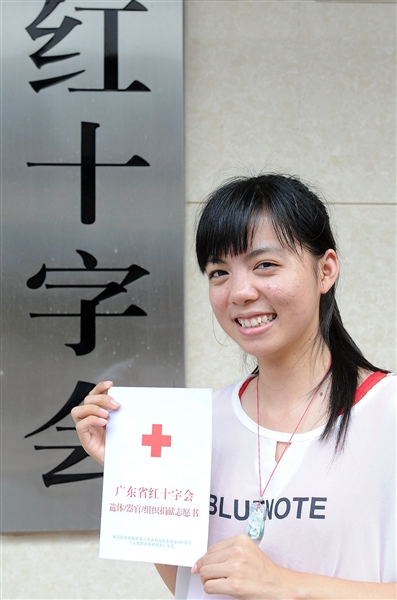 继薛文英和廉江一位老者后,她是目前在我市签署了“广东省红十字会遗体/器官/组织捐献志愿书”的第3人,也是最年轻的一位。