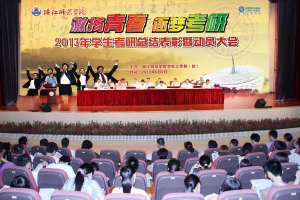 广东省教育厅网6月7日讯 6月5日晚,湛江师范学院2013年学生考研总结表彰暨动员大会在该院音乐厅隆重举行。湛江师范学院罗海鸥院长、刘海涛副书记、院长办公室邓逢光主任、教务处程可拉处长、学生处李粤处长、校团委郭和才书记、校内各二级学院院长(书记)、副书记出席了会议。会议由程可拉处长主持。