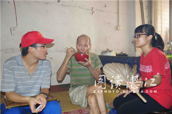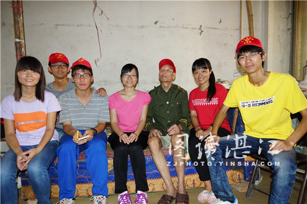 聊天中陈伯伯的乐观与坚强时时刻刻感染着志愿者们。双手捧着一碗热气腾腾的面条,老人边吃边鼓励志愿者们要认真学习。记性特别好的他还常常会谈起以前常常来探望他的已经毕业的师兄师姐,嘴上虽然念叨着他们那么久都不来看望,脸上却流露出满意的笑容。临走之前,陈伯伯让志愿者到房间内拿一套军装给他穿上,还带着志愿者帽子,大家一起拍一个合照。走到木门前,志愿者们依然不舍地回头叮嘱陈伯记得吃电饭煲里的面条和喝多点水。感动之余,陈伯激动地说了一句“谢谢”,送别了在楼道上的志愿者,轻轻地关上那道木门。