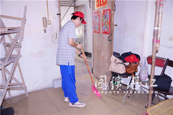 寒暄了几句之后,志愿者们开始分工合作,为陈伯伯打扫卫生、修理电器、洗菜做饭。屋内虽然堆积了许多废旧的物品,但却明显看得出志愿者们每周探望陈伯伯时清理打扫过的痕迹。那台音质已经不太清晰的收音机依然是陈伯伯平常生活中最大的兴趣所在。