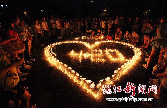 在活动开始之前,同学们献爱心的情怀格外高涨,纷纷在祝福墙上写下对雅安的祝福之语,表达湛师人对灾区人民的热忱牵挂。接着,志愿者们用点燃的蜡烛在地板上摆出夺目的心形,路过的同学纷纷停步,手里捧着蜡烛,围拢着那颗炽热的爱之心,默默地为雅安祈福。最后,举行了肃穆的哀悼,在场的所有同学为罹难同胞默哀三分钟。默哀毕,同学们发出了“雅安!加油!”的震彻心脾的呼喊。此外,数科院学子们积极地将爱心付之于行动中,活动当天,共筹得善款6329.1元。让我们为雅安祈福、为四川祈福,雅安人坚强!雅安人不哭!湛师人心系雅安,全国人民与雅安同在。