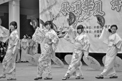 13日现场上演的节目,包括日本舞蹈、中国诗歌朗诵、日本动漫cosplay、日文吉他弹唱、歌舞《七色的明日》、中日混合走秀以及中国传统相声及欢乐群舞等。舞台两旁,还有花道、茶道等日本传统文化展示。