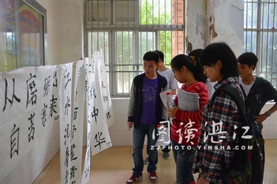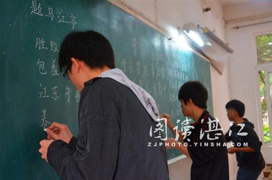 比赛项目分为三组,分别是粉笔组,钢笔组和毛笔组。其中,粉笔字和钢笔字比赛分别榕燕楼105室和103室举行,在105室的三尺讲台上,选手们挥洒粉笔,有的运笔有起有落,笔连自然,一只粉笔在他们手下幻化成优美灵动的汉字;有的选手运笔虽慢,但写出的粉笔字却架构优美,隽秀大方。此外,在榕燕楼的103室却是另一番场景,在安静的教室里,同学们各自将抽到的一首古诗词认真细致地写在纸上。同学们的钢笔字风格不一,有的楷书结构匀称,整体美观;有的行书如美女簪花,有的行书却龙飞凤舞,各展千秋。