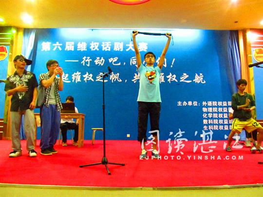 一个搞笑的话剧«天堂&天堂»拉开了本次维权话剧大赛的帷幕,因其搞笑诙谐,会场笑声不断,掌声不断。此外,把现场气氛带到高潮的是由化学科学与技术学院带来的话剧«旅途»,其话剧中讲的是我们生活中最容易上当受骗的把戏“分钱”,而剧中的女孩利用自己的聪明和维权知识与违法分子作斗争,最后赢回了属于自己的权利。在比赛的中间环节,为了缓解参赛选手的心情,还邀请了校街舞队的同学和物理学院魔术协会的会员给同学们带来轻松而精彩的表演。