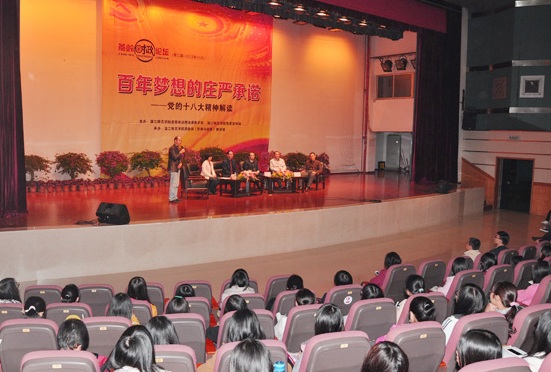 广东省教育厅网11月30日讯 11月28日晚,以“百年梦想的庄严承诺——党的十八大精神解读”为主题的湛江师范学院第三期“燕岭时政论坛”在音乐厅举行。本期论坛邀请了湛江师范学院党委梁英书记作主题发言,湛江师范学院党委宣传部陈恕平部长和思政部洪小瑛副主任、童小彪教授、叶继海博士作专题发言,五位嘉宾分别从不同的角度解读党的十八大精神。论坛由湛江师范学院思政部主任何增光教授主持。