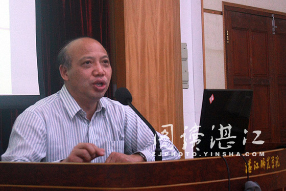 碧海银沙网11月24日讯 11月23日下午,暨南大学党委书记蒋述卓教授受邀在湛师图书馆学术报告厅作题为“古典诗词的生命精神与哲学智慧”的学术报告。湛师人文学院刘惠卿院长、唐雪莹副院长,办公室吴义庄主任以及部分相关学科老师出席了本次报告会。报告会由刘惠卿院长主持。手执一把古扇,蒋述卓教授便开始从“诗的悲情体现生命精神”与“诗的思索体现哲学智慧”两个角度为人文学子解读古典诗词。