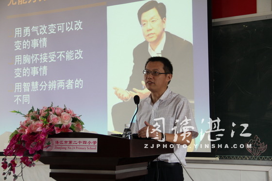 碧海银沙网10月22日讯 为加强教职工压力管理,提升教师的职业幸福指数。近日,由赤坎区教育局人事股主办,湛江市第二十四小学承办的“赤坎区教师队伍建设专家系列讲座”在市24小八楼会议室精彩开讲,该校特聘请湛江师范学院心理学专家雷学军副教授讲授了一堂主题为“教师压力管理”的讲座。来自赤坎区教育局人事股、教研室、市24小全体教师及兄弟学校教师代表共70多人聆听了讲座。