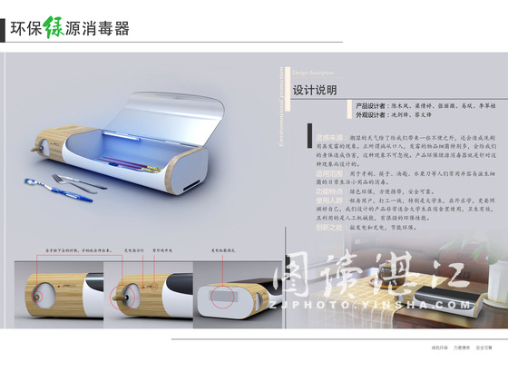 据陈木凤介绍道,环保绿源消毒器的设计理念主要源于拟实现一种环保节能、便于携带、操作简单、功能丰富以及外观新颖的消毒产品,以解决外出吃饭、旅游时的卫生问题。