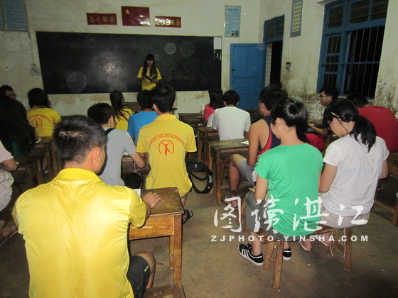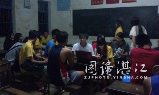碧海银沙网8月9日讯 前不久开展的三下乡活动,每天的例会是必不可少的,总结今天,安排明天,为次日的活动做详尽的准备。没有办公室,我们湛江师范学院“幸福红领巾”福彩队每天的例会,都在一年级的课室进行。只有一根白炽灯照亮着整个一年级的课室,每天晚上都是在这微弱的灯光下开会。