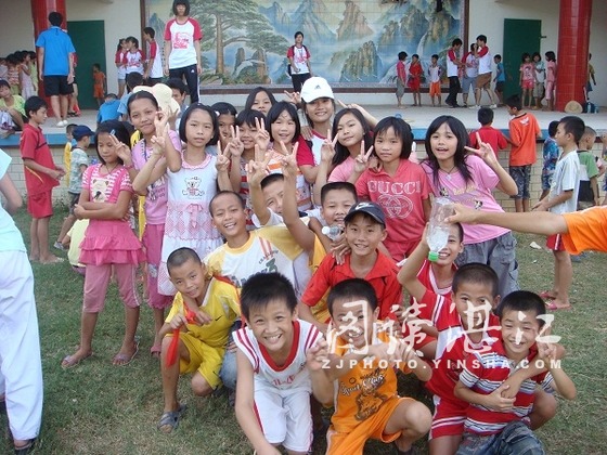 这里没有长而宽的800米橡胶跑道,有的是一片绿油油的天然大草坪;这里没有崭新的篮球架,有的是两个历经风吹雨打依然驻守在新家小学旁的生了锈的篮球框;这里没有比较完备的体育器材,有的只是我们实践队带过去让学生们玩的球类……可是这一切都无法阻挡孩子们活泼好动的天性,跳皮筋,老鹰捉小鸡,松鼠和大树,那些在城里的孩子眼里瞧不起的游戏,在新家村的孩子眼里很是有趣,他们的脸上永远洋溢着天真的微笑。是的,拥有这样的童年真好。我们利用小学里现有的条件给孩子们举办了一次趣味运动会,尽管拔河的项目因为绳子的出了些小问题无法进行,但是爱心传递、二人三足、往返跑的比赛中,他们都有与课堂上截然不同的表现,好像更加团结,更加融洽了。一声声呐喊助威让比赛中的同学身体里注入一股强大的力量,每一个人都在为同一个目标奋斗,每一个人都好认真,让我有一种莫名的感动。师生同台比赛,小老师们都倍感压力,跑步这些运动对于他们来说就是小菜一碟,而对于我们这些整天只坐在课室里学习,最多跑跑楼梯的娃儿来说,太困难了。准备参加比赛的小老师们都不约而同地感慨:“我们老了……”然后笑成一片。其实,输赢在这个赛场上并不重要,重要的是我们和学生们的心的距离在不断地缩小,慢慢靠近。