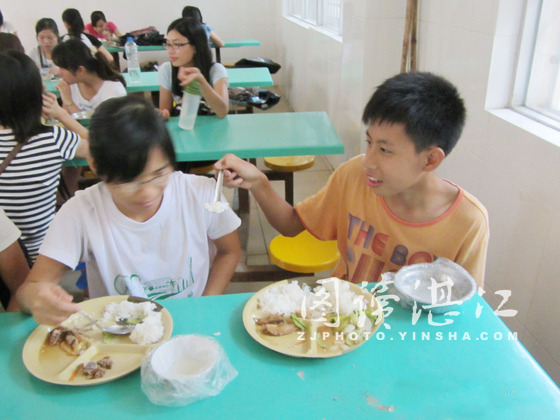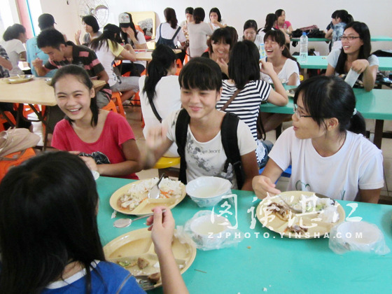 碧海银沙网7月27日讯 日前在吴川二中支教,忙碌了一个上午之后,湛师“灿烂夏花”实践队的队员和学生们一起回到食堂用餐。在这几天里,师生同一饭桌用餐已经成为吴川二中食堂一道亮丽的风景线了。