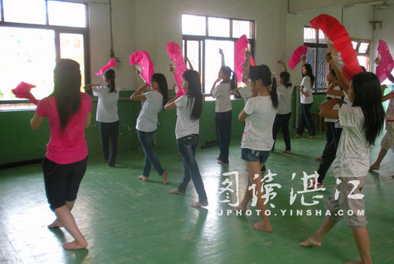 在舞蹈室里,随着有节奏的音乐,学生们正在认真地跟着老师练习集体舞蹈,他们的脸上充满着灿烂的笑容,据该任课老师说,集体舞蹈目的在于让学生们学会互相帮助、互相学习。
