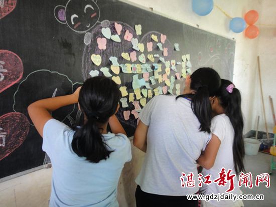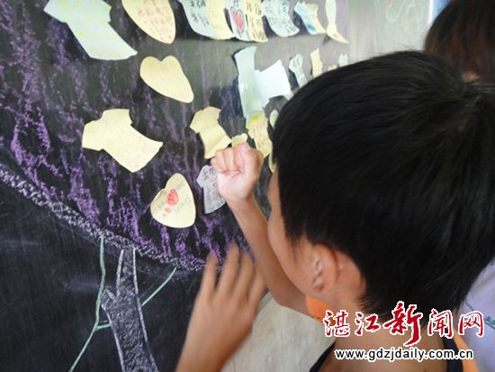 队员与孩子一起把心愿贴上(刘璨 摄)