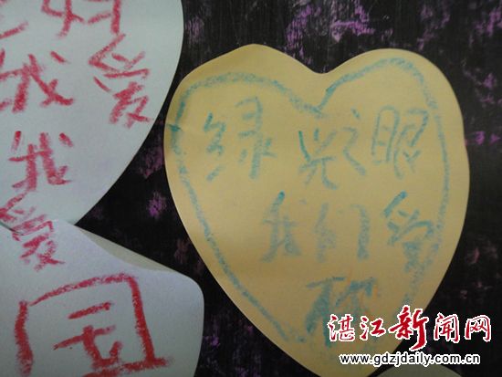 其中在最后的“绿色之心”的活动中,孩子们纷纷写下对美好家园的祝愿,希望市民可以讲卫生,为孩子们树立起好榜样,积极参与到“创国家卫生城市,建美丽幸福湛江”的创卫活动中来。其中有的孩子写道:“希望人人讲卫生,不要随便扔垃圾。”“希望我家门前的垃圾可以少一点,那条小河可以不那么臭,我就可以在那里玩了。”此次,“绿光之眼”创卫队以“管住脏乱差,留住真善美”为主旨,与孩子们一起建起“绿色之心”,为当地居民宣传创卫活动,同时代表孩子说出“还我美丽之家,创卫靠你我他”的心声。