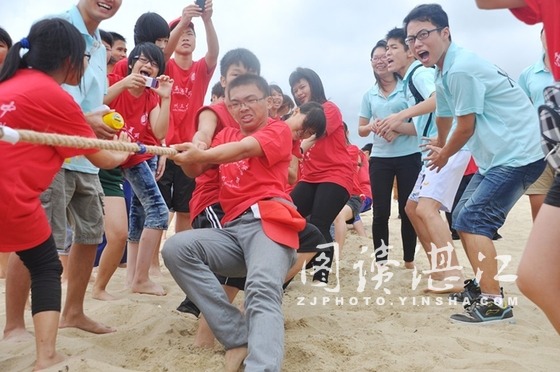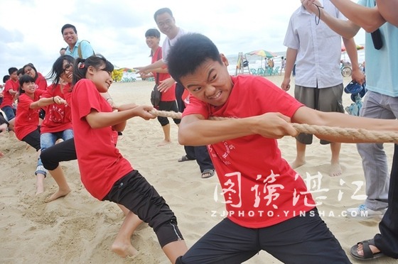 沙滩拔河赛现场气氛紧张激烈