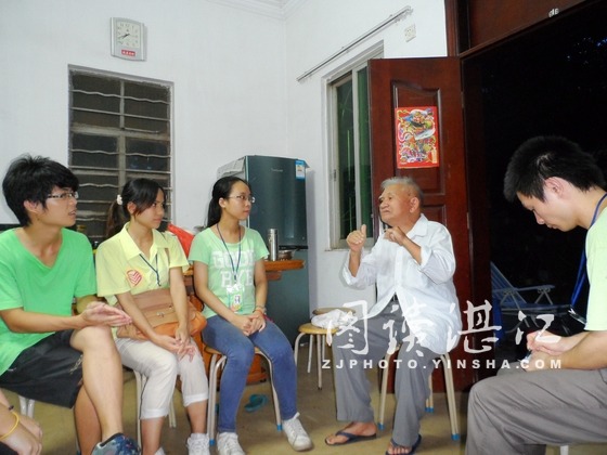 傍晚时分,夕阳余晖斜照。实践队员一行人提着一袋水果来到了黄国光老人的住处,老人正坐在院子里的大椅子上乘凉。对实践队员的登门拜访,他感到欣喜和欢迎。随后他领着队员来到了客厅,大伙刚坐下,老人便迫不及待和队员们聊起他的人生阅历,分享他的人生感言。