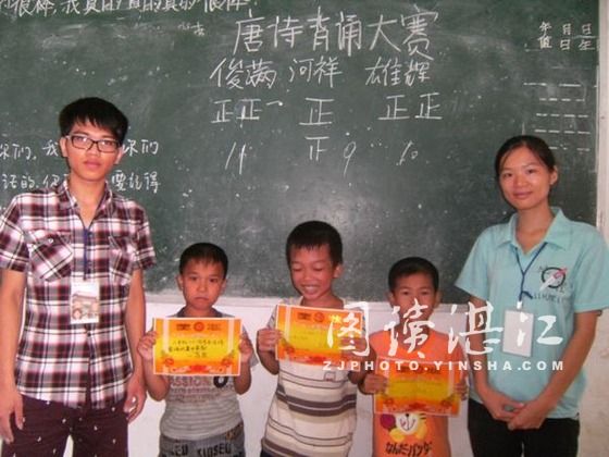 碧海银沙网7月18日讯 7月17彑日,为了检验同学们的学习成果,给同学们一个展示自我、锻炼自我的舞台,湛江师范学院"梦想地理一"实践队在容盛小学二年级教室举办了背诵古诗文大赛。