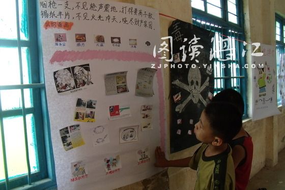 活动伊始,各班级助理班主任组织学生到教学楼一楼的教室里,本次宣讲活动以漫画海报展览的形式向同学们展示了关于黄赌毒邪的危害及食品安全等方面的时事新闻。队员李俊明在一旁耐心地为学生们作了讲解,语言生动且通俗易懂。学生们听得非常认真,还不时提出了疑问,并在场得到了解答。参观完毕后,学生在教员的带领下在横幅下认真地签下他们的名字。最后,邓协三下乡服务队将横幅挂在学校门口上。