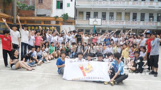 接下来的是,三人四足和气球游戏,实践队队员混进学生中,共玩同乐。在玩三人四足游戏时,一位女学生不小心跌倒了,其他同学扶她到旁边休息,擦药,但小女生不想放弃这么有趣的运动会,还没等擦完药就叫嚷着参加下一个项目。但最感人的,还要数在场师生合唱队歌《爱因为在心中》,唱着唱着,学生眼红红的,几个小女生还哭了,接着,很多人都跟着哭了,场面很感人,歌声在哽咽中传递着、回荡着。不少学生表示,他们哭,是因为实践活动快要结束了,小老师们就快要离开了,她们有太多的不舍。