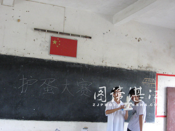 2012/7/15上午10点湛江师范学院读书协会三下乡社会实践队在博龙中学举办了第一届“护蛋”大赛。在大赛举办之前,我们的小老师要求参赛者把各自制作好的护蛋装置拿到讲台上向其他参赛选手展示,并介绍他们护蛋装置的特色之处。由于我们的参赛者是初次参赛,所以,他们在讲台上介绍他们的装置时有点羞涩和不知所措。于是我们的小老师也不忘在旁边“帮忙”介绍以缓解现场紧张的气氛。