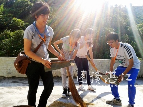 昨天下午5点左右,该实践队的4位队员,来到一名学前班小朋友的家中想家访,其时正赶上这家人傍晚收谷时间,于是队员们便走上天台,立即帮小朋友的家长收起谷子来。1男3女4个队员,有人拿铲子,有人拿扫把,配合得非常默契,很快便帮主人把谷子收好了。