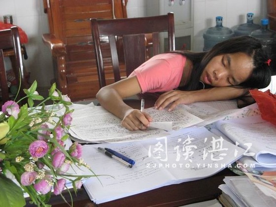 为了尽快评改完学生提交的试卷与作文,以总结支教情况,并对学习认真的小学生们给予一定奖励,鼓励他们更积极主动地学习,近日队员们都在不停地工作。尤其是支教组组长丽先,为工作常不惜放弃午睡时间,不停地为学生们评改作文。在忙碌了几个小时之后,她终于筋疲力尽,趴在桌子上睡着了。