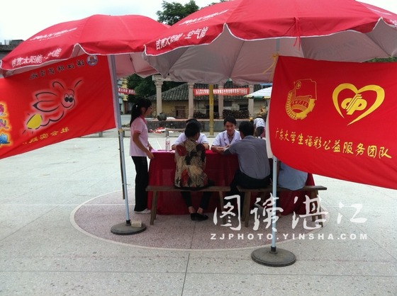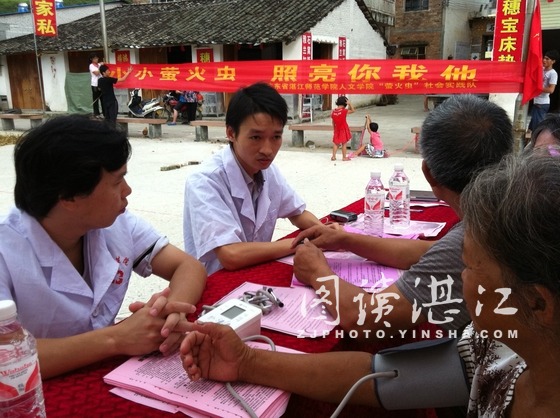 碧海银沙网7月13日讯 尊老爱老”是中华民族的传统美德,为了让人们更加关注老人这个弱势群体,湛江师范学院人文学院的“萤火虫”社会实践服务队于7月12日早上9点,在在广西省北流市石窝镇中心小学前的小广场举办了一个义诊活动。本次活动邀请到石窝镇卫生所的两名医生。