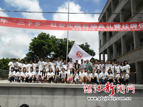 湛江新闻网7月9日讯 2012年7月9日上午十点半,湛师法政学院“飞翔”实践服务队在上洋中学的广场上举行了2012年暑期三下乡社会实践启动暨揭牌仪式,出席本次三下乡启动仪式的嘉宾有湛江师范学院法政学院党委全柱副书记、学生工作办公室副主任陈明娟老师、辅导员何一鸣和陈琳琳老师,上洋镇镇长助理、镇团委书记林小远,阳西县上洋中学校长欧昌铬以及校团委书记李孔钦、副书记卢锦昌。由此可见政府领导以及学校领导对“飞翔”社会实践队的支持力度以及亲切关怀。